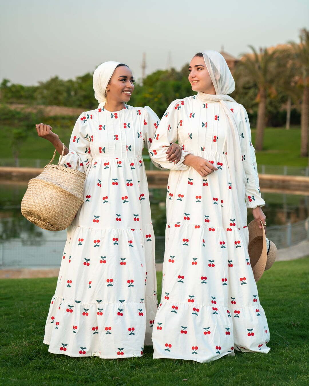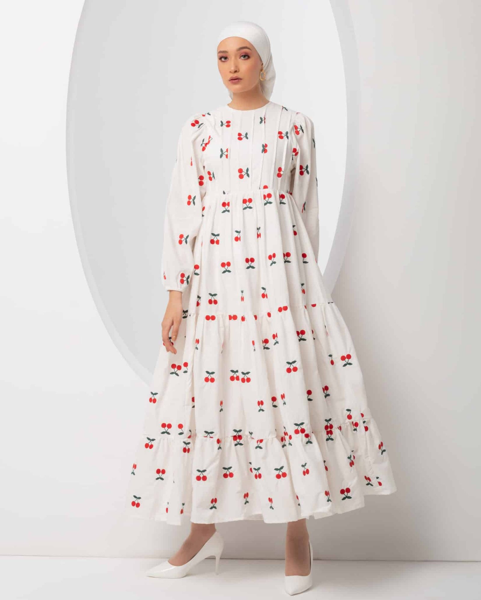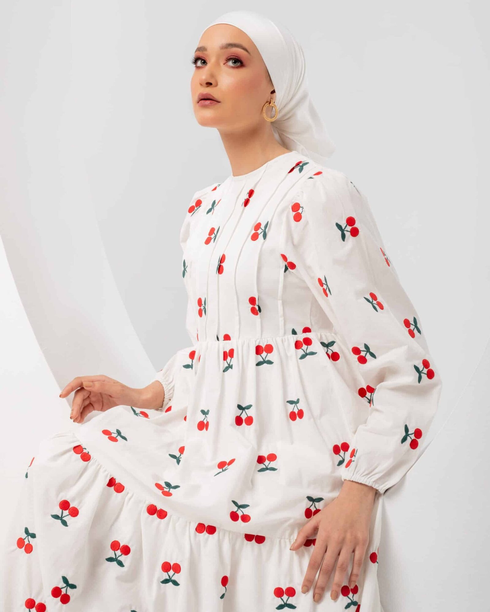 Made from pure premium cotton and lined with skin-friendly non-transparent material, you can wear it without any layering. Long dress. Embroidered with red cherries.