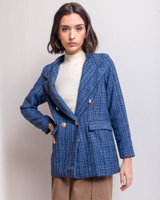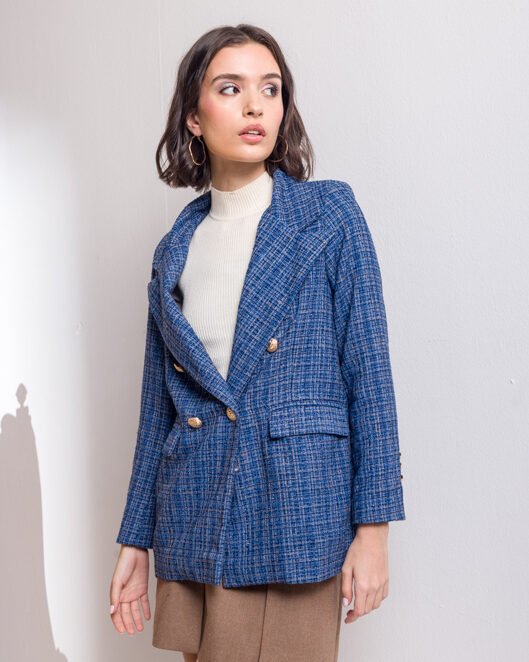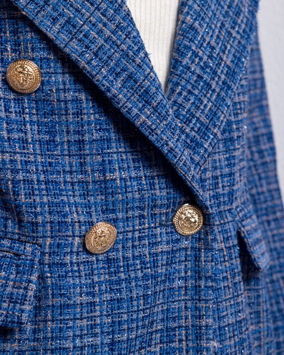 A navy blue blazer is a must-have if you are looking for elegance, style, and yet practicality. the blazer is made from French tweed with a regular silhouette, double-breasted golden buttons, and side flap pockets.