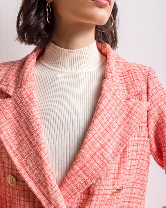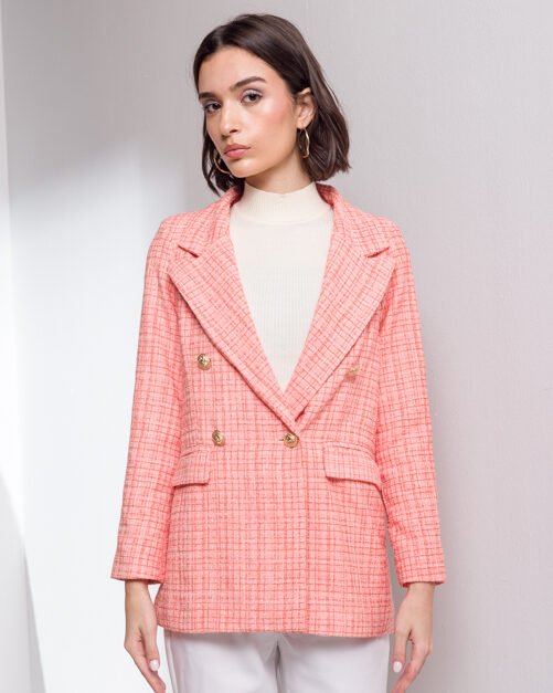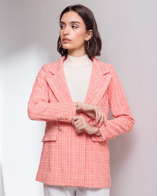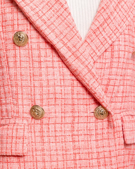 This peach blazer is a must-have if you are looking for elegance, style, and yet practicality. the blazer is made from French tweed with a regular silhouette, double-breasted golden buttons, and side flap pockets.